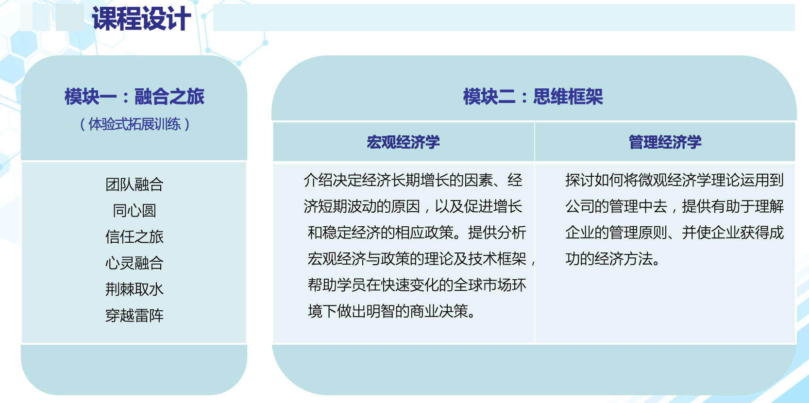 課程體系由知識(shí)性學(xué)習(xí)和實(shí)戰(zhàn)訓(xùn)練兩大部分組成。知識(shí)性學(xué)習(xí)包括:管理經(jīng)濟(jì)學(xué)、宏觀經(jīng)濟(jì)學(xué)、組織行為學(xué)