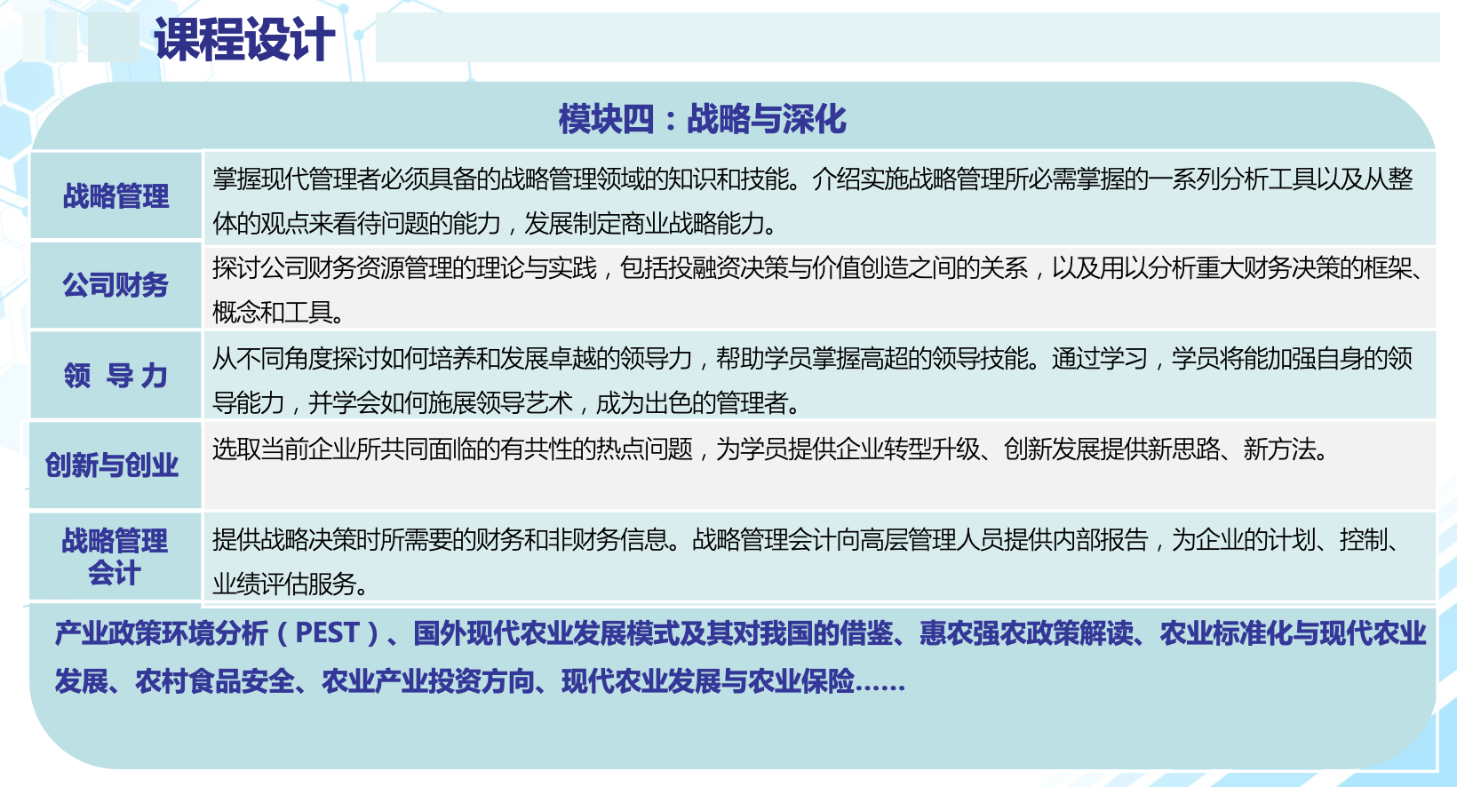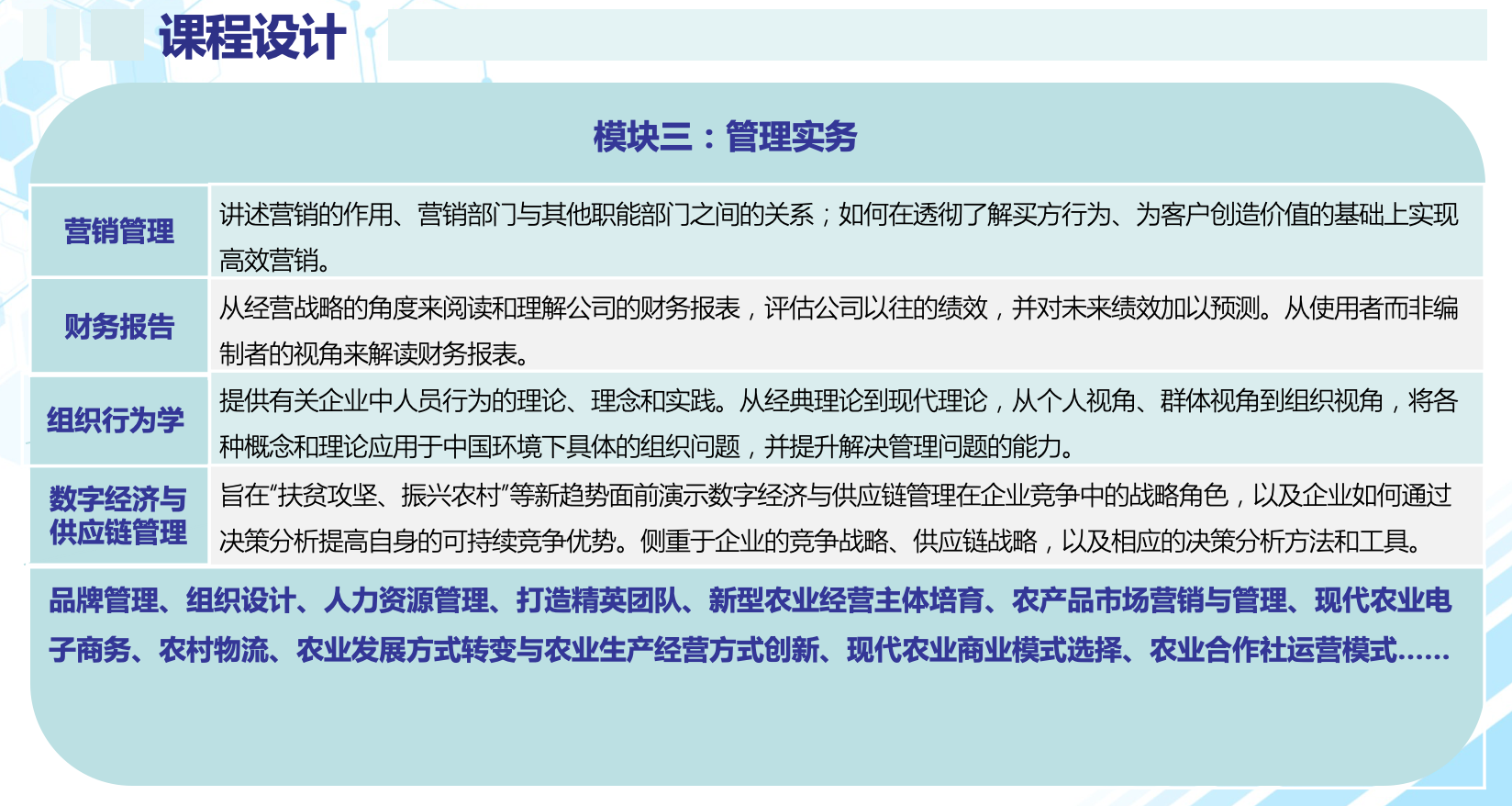 營(yíng)銷管理、財(cái)務(wù)報(bào)告、供應(yīng)鏈管理與決策分析、戰(zhàn)略管理會(huì)計(jì)、戰(zhàn)略管理、領(lǐng)導(dǎo)力公司財(cái)務(wù)、創(chuàng)新與創(chuàng)業(yè);